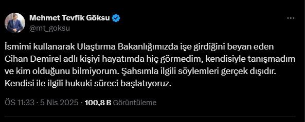 “İsmimi kullanarak Ulaştırma Bakanlığımızda işe girdiğini beyan eden Cihan Demirel isimli kişiyi hayatımda hiç görmedim, kendisiyle tanışmadım ve kim olduğunu bilmiyorum. Şahsımla ilgili telaffuzları gerçek dışıdır. Kendisi ile ilgili türel süreci başlatıyoruz.”